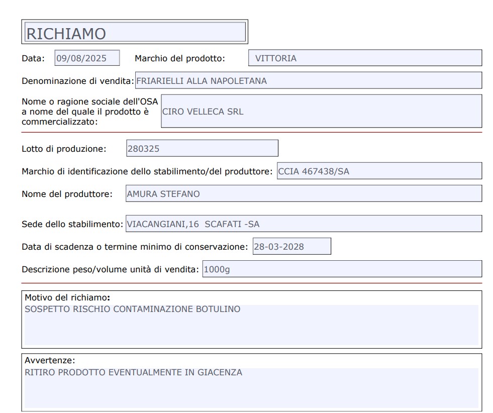 Ristoranti e attività di street food devono fare attenzione: il Ministero della Salute ha disposto il ritiro immediato di quattro lotti di friarielli alla napoletana per sospetto rischio di contaminazione da Clostridium botulinum, il batterio responsabile del botulismo.