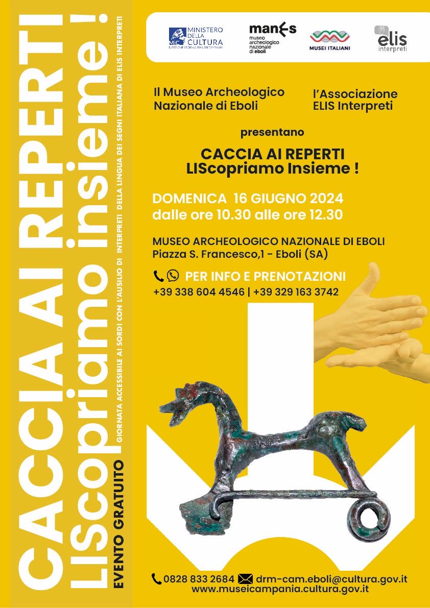 Domenica 16 giugno, dalle ore 10,30 alle ore 12,30, il Museo archeologico nazionale di Eboli e l’Associazione Elis Interpreti presentano “Caccia ai reperti: LIScopriamo insieme”, un laboratorio inclusivo accessibile anche alle persone sorde, con l’ausilio di interpreti della LIS – Lingua dei Segni.
