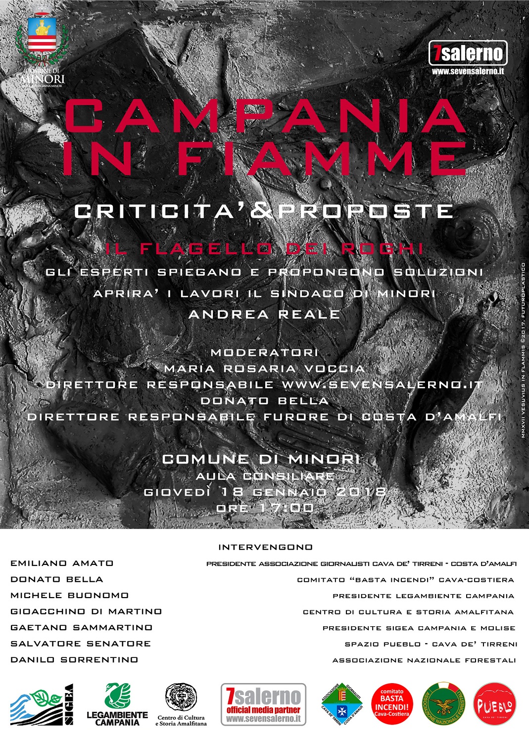 Alla luce dei roghi che hanno flagellato per tutta l’estate appena trascorsa la Regione Campania, e per rispondere concretamente alle richieste legittime da parte dei residenti di capire e chiedere soluzioni, il sito di informazione SEVENSALERNO, nella persona del direttore responsabile dr.ssa Maria Rosaria Voccia, Giornalista, ha ideato ed organizzato un Convegno Focus itinerante dal titolo “Campania in Fiamme: Criticità & Proposte”, realizzato nella sua prima tappa il 1°settembre 2017 presso il Museo Diocesano San Matteo a Salerno e successivamente al Comune di Cava de’Tirreni il 26 ottobre 2017.