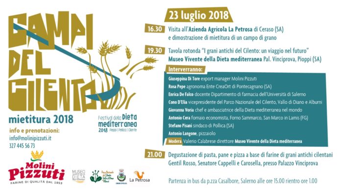 Un evento ambientato tutto nel Cilento e dedicato alla riscoperta dei grani antichi. Si tratta di “Campi del Cilento – Mietitura 2018”, organizzato per lunedì 23 luglio dalla Molini Pizzuti – azienda salernitana con cinquant’anni di esperienza nella molitura e nella produzione di farine di grano tenero – in collaborazione con l’associazione Unisapori, il Crea (Consiglio per la ricerca e la sperimentazione in agricoltura), il Dipartimento di farmacia dell’Università di Salerno, l’Azienda agricola La Petrosa di Ceraso e il Museo Vivente della Dieta mediterranea di Pioppi.