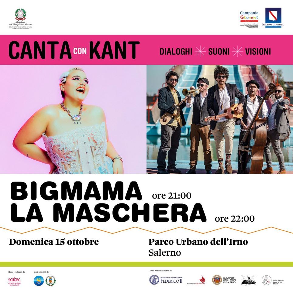 Saranno BigMama e La Maschera a chiudere domani la prima edizione di Canta con Kant. Dialoghi, suoni, visioni, il festival della musica e della filosofia in corso al Parco urbano dell’Irno di Salerno (12-15 ottobre). Il programma dei talk filosofici del 15 ottobre avrà come protagonisti Antonio Gnoli, Massimiliano Valerii e Nello Cristianini al Teatro “Antonio Ghirelli”.