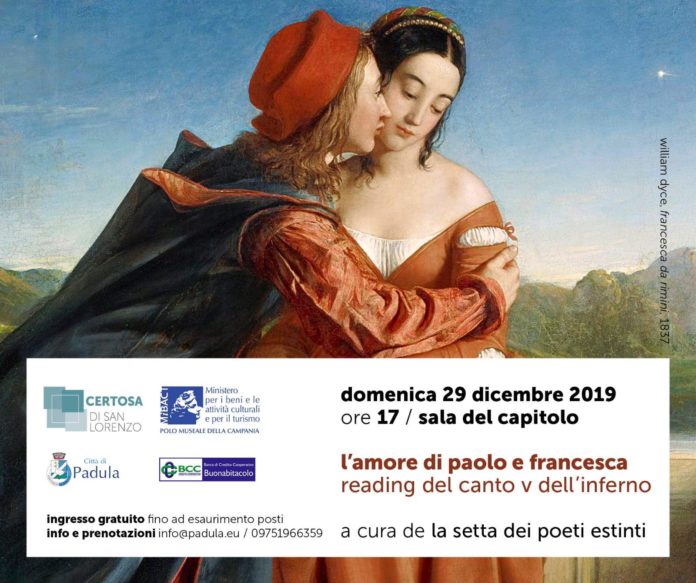 L’amore di Paolo e Francesca narrato da Dante Alighieri nel Canto V dell’Inferno, della Divina Commedia, letto e raccontato nelle stanze della Certosa di San Lorenzo a Padula, un gioiello italiano di bellezza. Una serata unica, ricca di arte e poesia.
