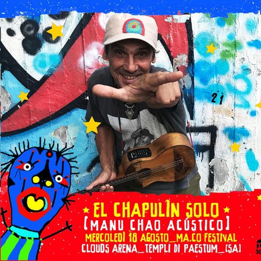 MERCOLEDÌ 18 AGOSTO, il Dum Dum Republic, in partnership con il Maco Festival, si trasferirà nella cornice suggestiva dei Templi di Paestum, all’interno della Clouds Arena, per il concerto del cantautore e musicista di fama internazionale Manu Chao. L’artista franco-spagnolo torna live in versione acustica, accompagnato da Luciano Falico alla chitarra e Mauro Mancebo alle percussioni. Manu Chao, al secolo José Manuel Arturo Tomás Chao Ortega, nasce a Parigi da padre galiziano e madre basca in fuga dalla dittatura di Franco. Trascorre la sua infanzia respirando arte, libertà e diritti umani. Con i Mano Negra inizia a lasciare il segno nel mondo della musica; canta in francese, inglese e spagnolo, fonde culture e stili differenti, come il patchanka, che spaziano dal reggae al rock, dal rap alla musica iberica. Il successo mondiale arriva nel 1998 con il debutto solista “Clandestino”, di cui i diritti umani, la fuga e l’impegno civile e sociale sono colonne portanti, mentre le sonorità sono dominate da ritmi sudamericani e africani. Resta una personalità libera e anticonformista, un’icona musicale e culturale, un cittadino del mondo che ispira più generazioni.