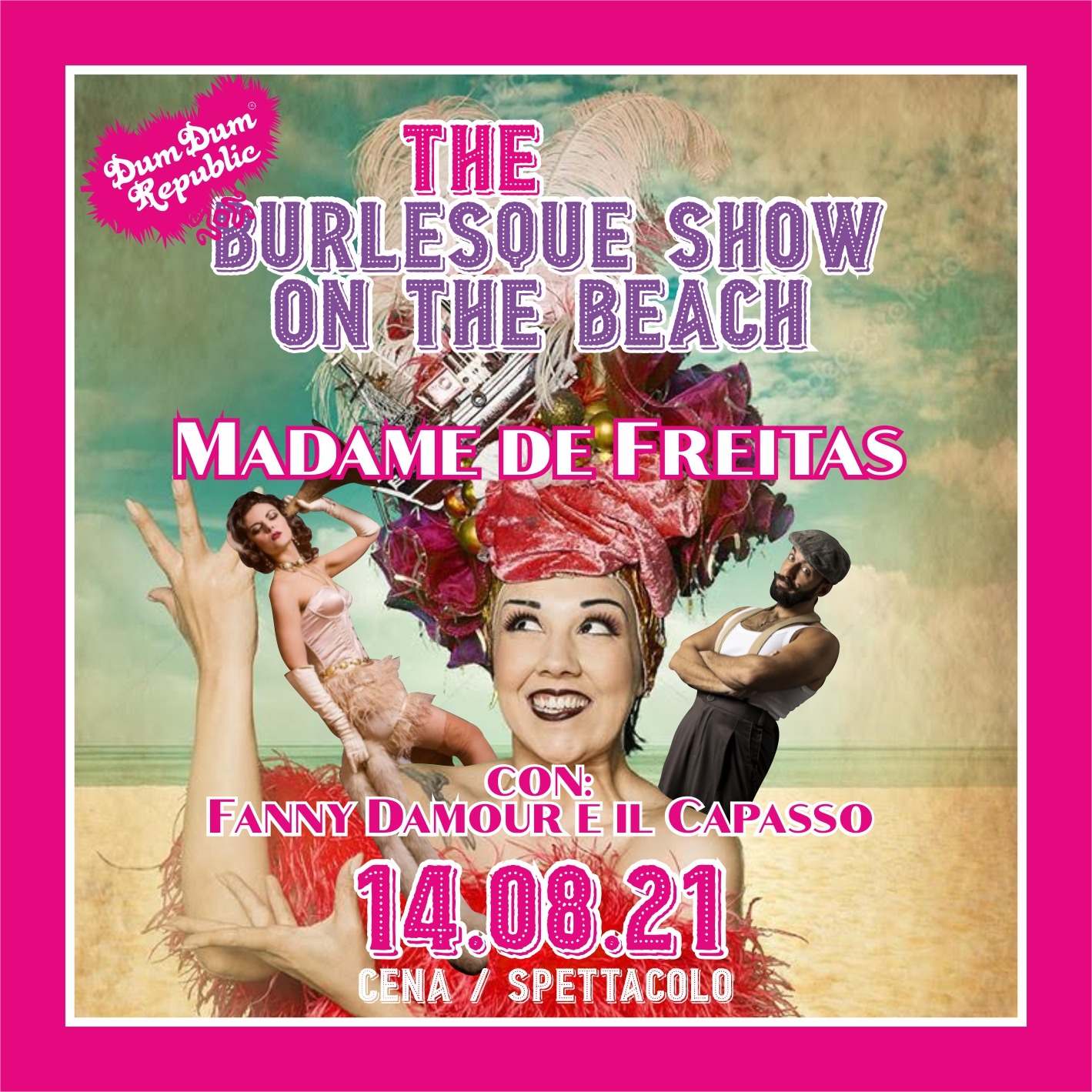 SABATO 14 AGOSTO ore 20.30 il grande Cabaret della Belle Èpoque è in scena al Dum Dum Republic con la cena spettacolo in spiaggia “The Burledque Show on the Beach” con Madame Maria De Freitas e la performance di Fanny Damour e de Il Capasso, mentre la spiaggia del più famoso beach club del Cilento si trasforma in un tabarin francese di inizio Novecento: un grande contenitore creativo tra musica, varietà e performing act.