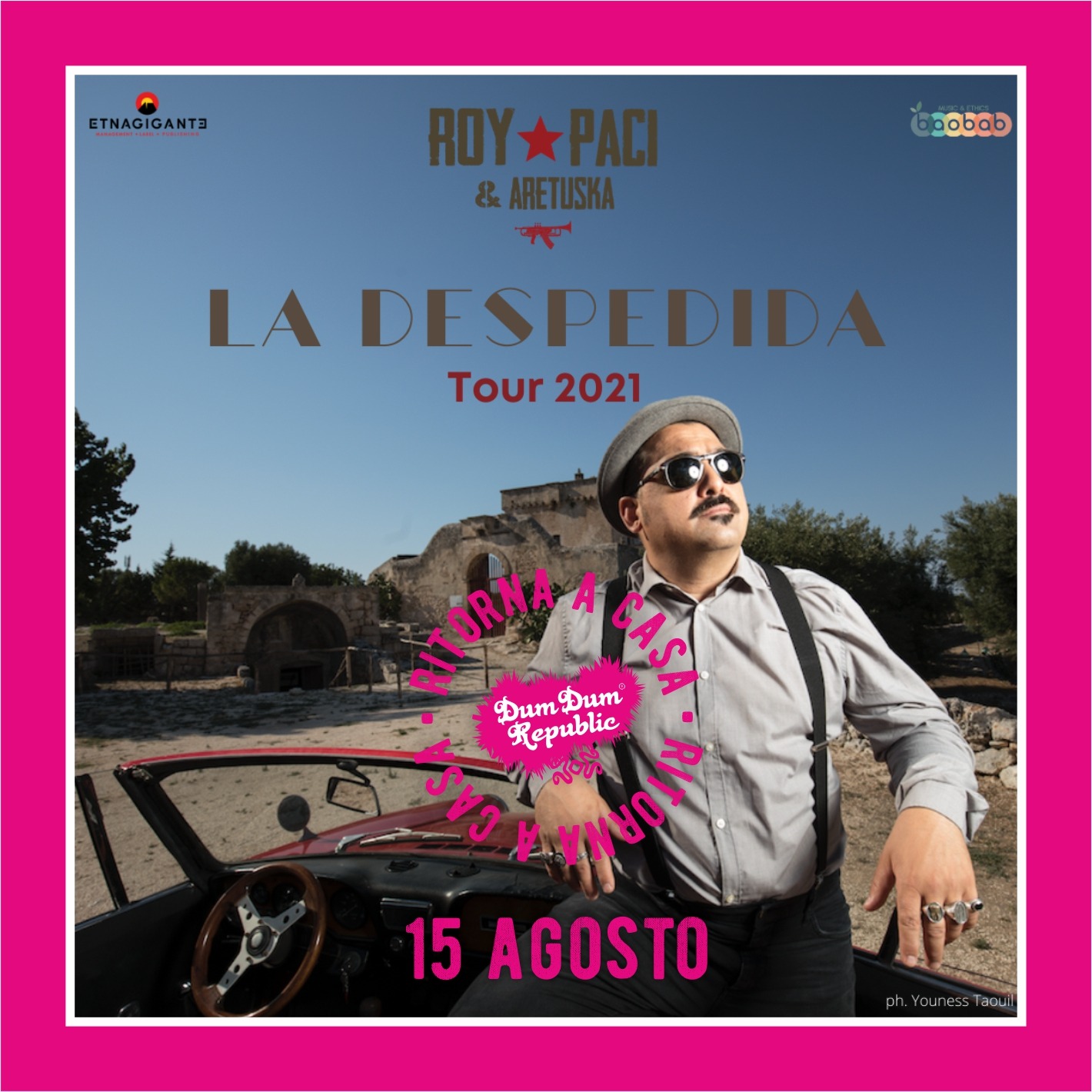 Finalmente potrà partire la musica live, insieme alle tante anime che vivranno questa esperienza conclusiva, anche se in modo diverso rispetto al passato: la Despedida tour sarà un momento di condivisione, proponendo successi iconici dei grandi album e scoprendo brani, delle piccole “rarità”, mai inseriti nei precedenti live dal vivo. Roy Paci porterà sul palco questo intenso cammino con Aretuska, raccontando, attraverso le sue canzoni, un percorso artistico vario che ha fatto ballare ed emozionare aficionados di tutto il mondo, dai festival internazionali come il Womad Reading Festival, Hit Week a New York, Sziget Festival in Ungheria, Festival de Verão di Salvador Bahia, Blue Frog Festival di Mumbay e girato in lungo ed in largo per l’Italia portando energia e “beleza”.