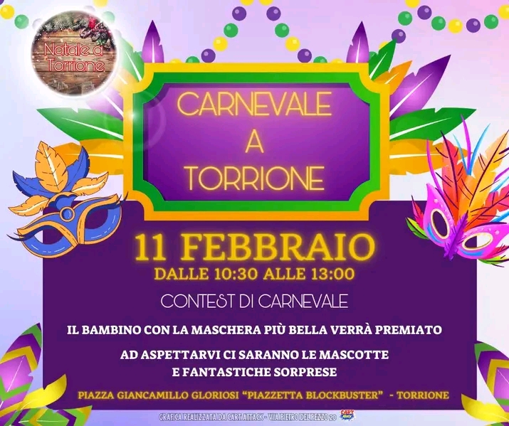 Nella centralissima Piazza Giancamillo Gloriosi conosciuta anche come Piazza Blockbuster, i commercianti del quartiere Torrione hanno organizzato la manifestazione “ Carnevale a Torrione” dopo il successo di Natale a Torrione che ha coinvolto commercianti, artisti , famiglie bambini , poeti , giornalisti ,atleti, il gruppo di commercianti e artigiani rappresentato dal calzolaio salernitano Salvatore Clemente questa volta riempirà di coriandoli e allegria il quartiere della zona orientale di Salerno.