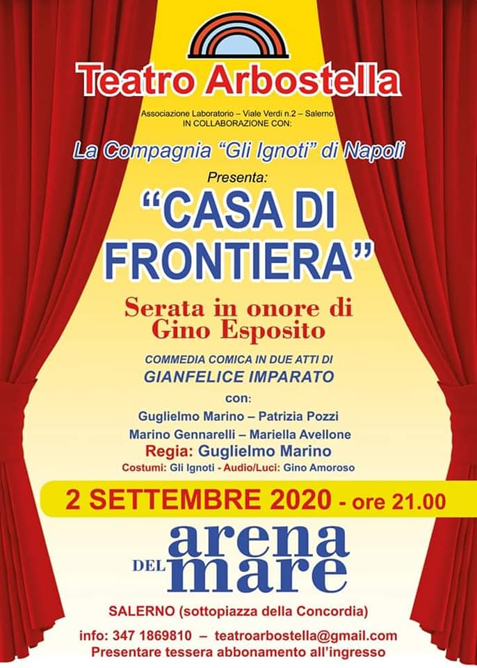 Secondo e penultimo appuntamento per il Teatro Arbostella di Salerno nel ricco cartellone dell’Arena del Mare, location prescelta dal Comune di Salerno per far ripartire il mondo dello spettacolo dopo lo stop dovuto al Covid. Mercoledì 2 settembre serata del tutto particolare nella platea del sotto-piazza della Concordia. Il mondo teatrale salernitano, attori, registi, produttori e direttori artistici ricorderanno tutti insieme Gino Esposito, il patron del Teatro Arbostella scomparso improvvisamente a fine aprile, nel periodo del lockdown durante il quale non ha potuto beneficiare dell’ultimo saluto di quanti lo hanno conosciuto e stimato.