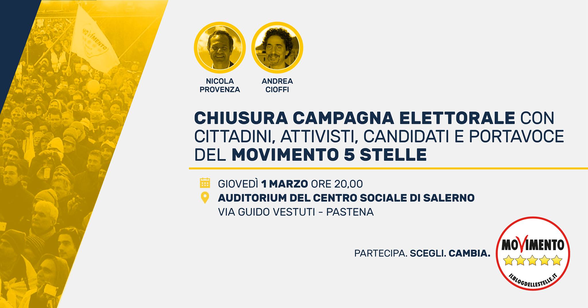 Giovedì 1 Marzo alle ore 20, presso l’Auditorium del Centro Sociale di Salerno in via Guido Vestuti il Movimento 5 Stelle chiude la campagna elettorale. All’incontro prenderanno parte Nicola Provenza candidato al collegio uninominale di Salerno per la Camera dei Deputati, e il Senatore Andrea Cioffi candidato al collegio uninominale di Salerno per il Senato della Repubblica.