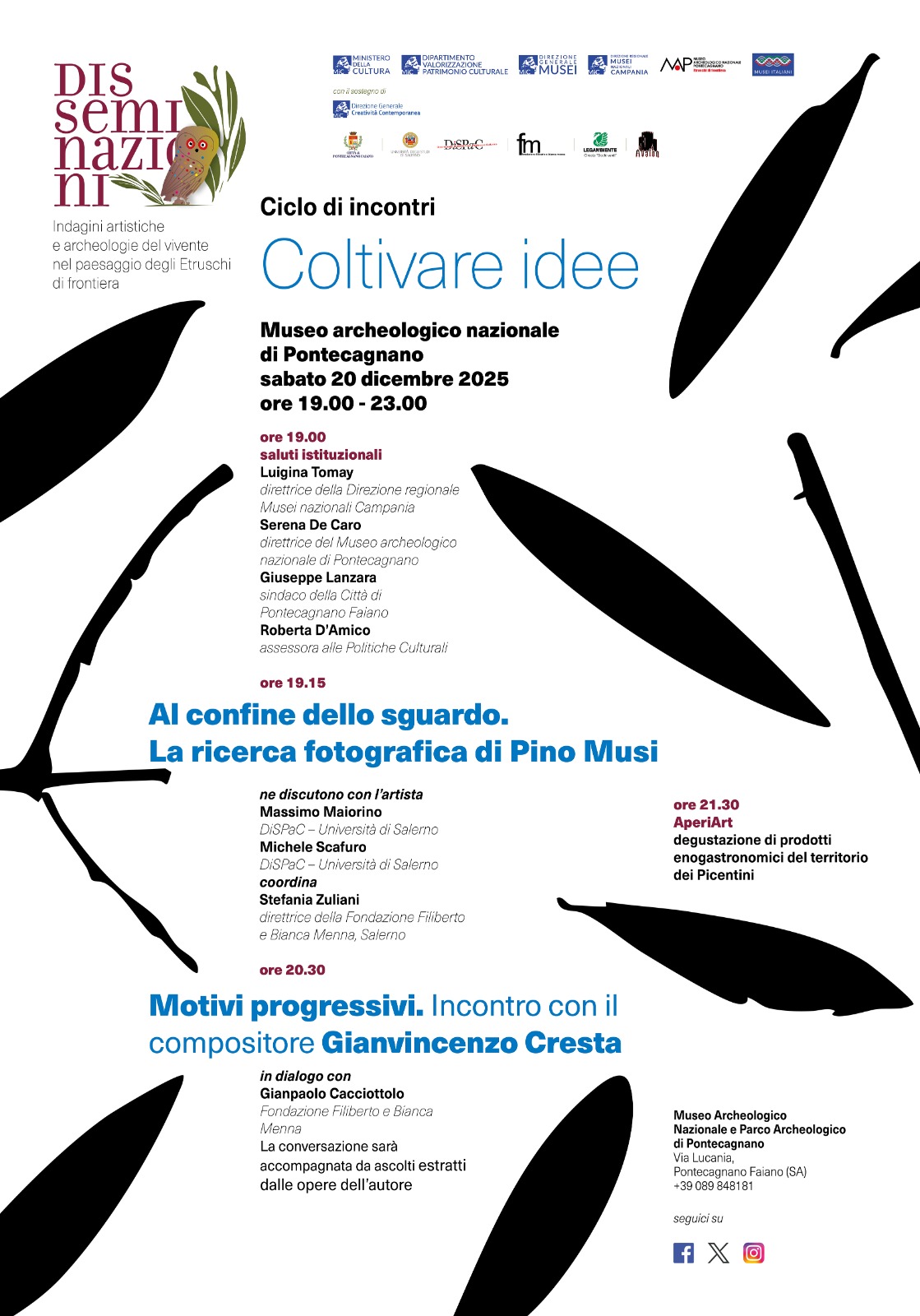 Sabato 20 dicembre 2025 il Museo archeologico nazionale di Pontecagnano dedica un’apertura serale straordinaria fino alle 23.00 al nuovo appuntamento del ciclo di incontri “Coltivare idee”, organizzato nell’ambito del progetto “Disseminazioni. Indagini artistiche e archeologiche del vivente nel paesaggio degli Etruschi di frontiera” della Direzione regionale Musei nazionali Campania, sostenuto da Il Museo Rigenera, promosso dalla Direzione Generale Creatività Contemporanea del Ministero della Cultura.