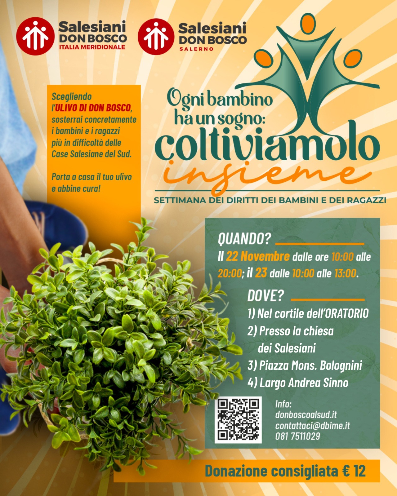 A Salerno parte l’iniziativa dei Salesiani: “Ogni bambino ha un sogno: coltiviamolo insieme” per sostenere i diritti dei minori I Salesiani di Salerno e del Sud Italia lanciano la campagna “Ogni bambino ha un sogno: coltiviamolo insieme” in occasione della Settimana dei Diritti dei Bambini e dei Ragazzi, in programma dal 18 al 25 novembre. L’obiettivo è sensibilizzare e sostenere i progetti educativi per i più piccoli attraverso iniziative di solidarietà e una raccolta fondi nelle città del Sud, tra cui Salerno.