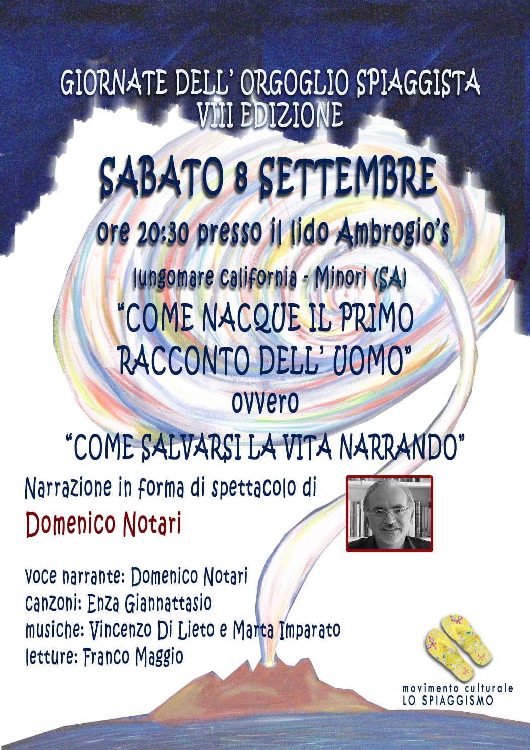 Lo scrittore salernitano Domenico Notari, (è appena uscito il suo romanzo “9, la rabbia del rivale” esito da Castelvecchi), porta in scena nell’ambito dell’VIII edizione delle “Giornate dell’orgoglio Spiaggista” lo spettacolo sottoforma di recital “Come nacque il primo racconto dell’uomo”, ovvero ” come salvarsi la vita narrando”.