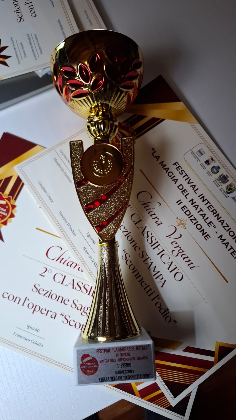 In seguito alle ultime pubblicazioni Chiara Vergani ha partecipato ad un importante concorso internazionale “La magia del Natale”, un evento di altissimo rilievo non solo locale, organizzato da Officina Mediterranea nella splendida cornice di Matera, con il prestigioso patrocinio della Regione Basilicata ottenendo un successo straordinario.