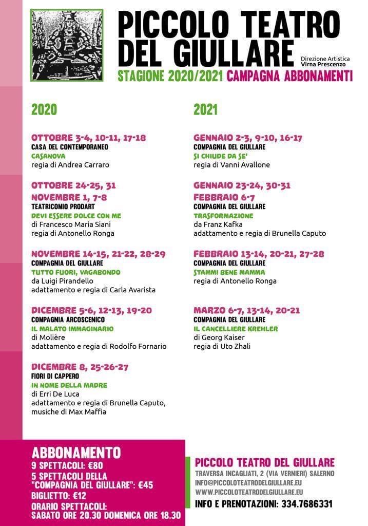 Per il secondo spettacolo in cartellone, Teatricomio Prodart porterà in scena “Devi essere dolce con me” di Francesco Maria Siani, per la regia di Antonello Ronga (ottobre, 24-25, 31; novembre 1, 7-8). Sempre a novembre, la Compagnia del Giullare proporrà “Tutto fuori, vagabondo” di Luigi Pirandello, adattamento e regia di Carla Avarista (novembre 14-15; 21-22; 28-29). La Compagnia Arcoscenico è in cartellone con “Il malato immaginario” di Molière, adattamento e regia di Rodolfo Fornario (dicembre 5-6; 12-13; 19-20). A seguire, reduce dal successo riscontrato al Teatro dei Barbuti questa estate, Fiori di Cappero porterà in scena “In nome della madre” di Erri De Luca, adattamento e regia di Brunella Caputo, musiche di Max Maffia (dicembre 8; 25-26-27). Sarà la Compagnia del Giullare ad inaugurare il nuovo anno, il 2021 con quattro nuovi spettacoli. Il primo è “Si chiude da sé”, per la regia di Vanni Avallone (gennaio 2-3; 9-10; 16-17). Poi sarà la volta di “Trasformazione” di Franz Kafka, adattamento e regia di Brunella Caputo (gennaio 23-24; 30-31 e febbraio 6 e 7). A febbraio spazio a “Stammi bene mamma”, per la regia di Antonello Ronga (febbraio 13-14; 20-21; 27-28). Il sipario si chiuderà a marzo (6-7; 13-14, 20-21) con “Il cancelliere Krehler” di Georg Kaiser, per la regia di Uto Zhali. Tutti gli spettacoli del sabato inizieranno alle 20.30, quelli della domenica alle 18.30. Biglietto 12 euro; abbonamento a 9 spettacoli: 80 euro; abbonamento a 5 spettacoli della Compagnia del Giullare: 45 euro.