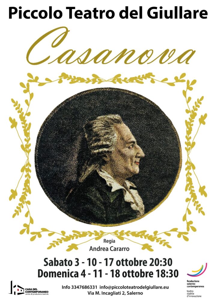 Lo spettacolo andrà in scena per tre fine settimana: sabato 3 ottobre (ore 20.30), domenica 4 ottobre (ore 18.30); sabato 10 ottobre (ore 20.30) e domenica 11 ottobre (ore 18.30); sabato 17 ottobre (ore 20.30) e domenica 18 ottobre (ore 20.30). Casanova è interpretato da Andrea Carraro, voce fuori campo, Amelia Imparato. Audio e luci, Virna Prescenzo. Effetti e riprese audio: Fabio Notari. Studio registrazioni: LagartijaStudioRecording. Costumi, Bottega San Lazzaro; assistente regia, Angelo Ruocco.