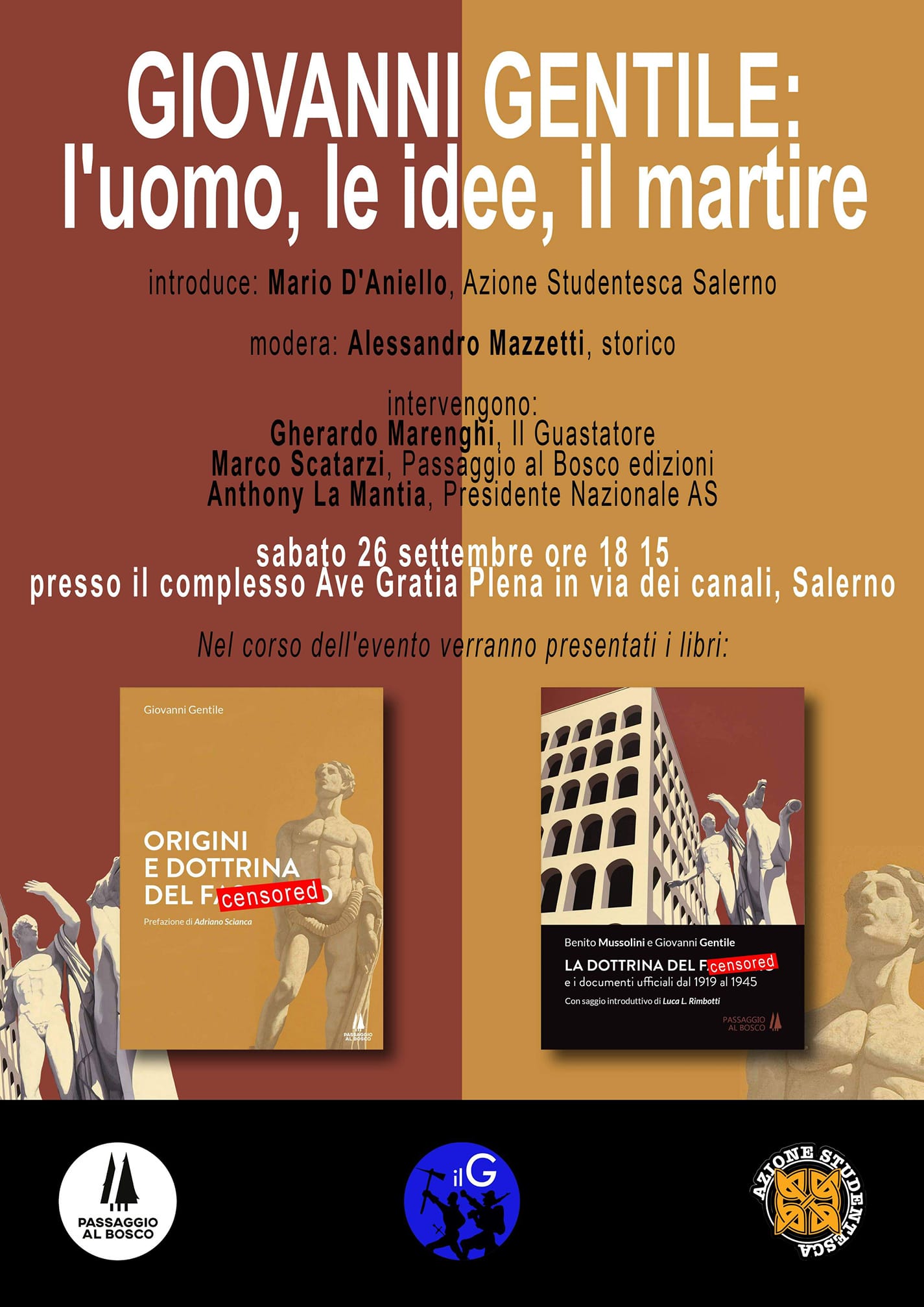 Azione Studentesca Salerno in collaborazione con la rivista di approfondimento politico-culturale “Il Guastatore” organizza il convegno dal titolo “Giovanni Gentile: l’uomo, le idee, il martire” che si terrà presso il complesso Ave Gratia Plena in Via dei Canali, sabato 26 Settembre alle 18:15.