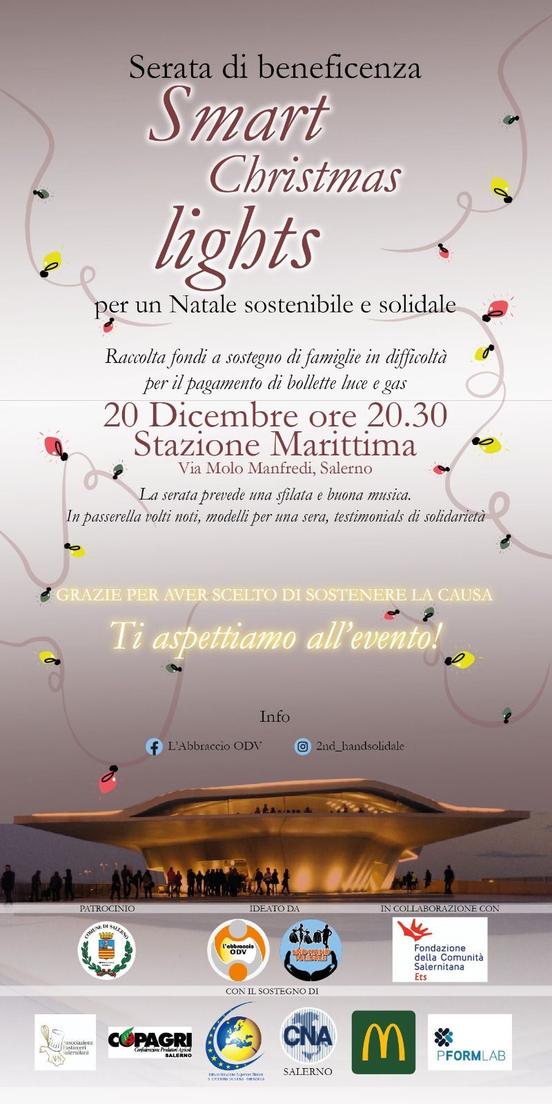 La Copagri Salerno, con la sua presidente provinciale Angela Pisacane, aderisce all’iniziativa organizzata dall’associazione “L’Abbraccio odv” e denominata “Smart Christmas Light”. Si tratta di una serata di beneficenza che si terrà a Salerno, martedì 20 dicembre alle ore 20.30 alla Stazione Marittima Zaha Hadid in via Molo Manfredi e che avrà come scopo quello di raccogliere fondi a sostegno delle famiglie in difficoltà per il pagamento delle bollette di luce e gas.