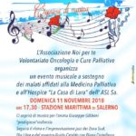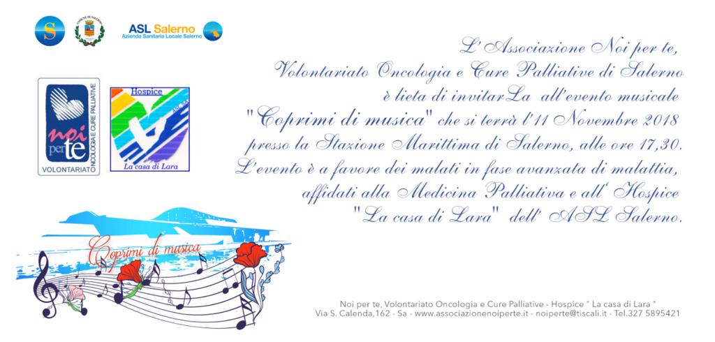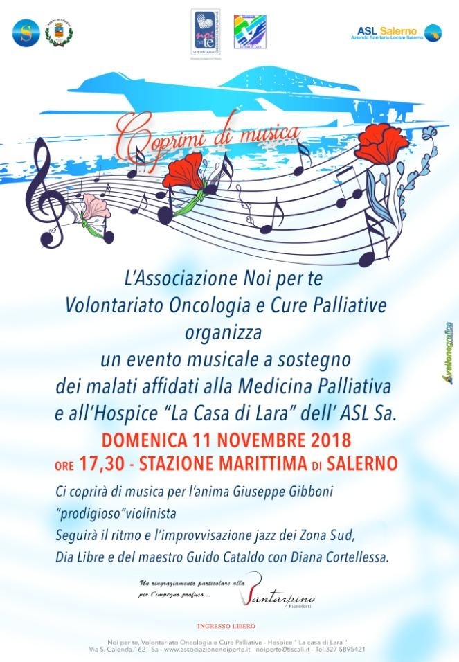 Domenica prossima, 11 novembre, alle ore 17:30 presso la Stazione Marittima di Salerno, si svolgerà l’evento musicale “Coprimi di musica”, organizzato dall’Associazione “Noi per te”, Volontariato Oncologia e Cure Palliative di Salerno, a sostegno dei malati in fase avanzata di malattia, affidati alla Medicina Palliativa e all’Hospice “La casa di Lara” dell’ASL Salerno.