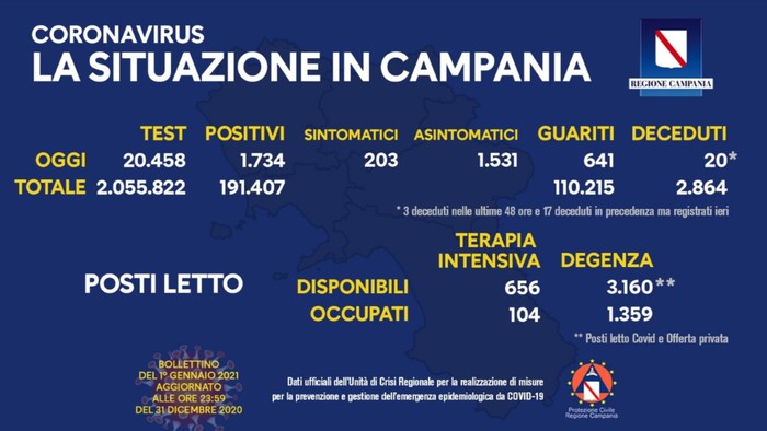 Coronavirus, aggiornamento 1 gennaio, 20 decessi e 1.734 nuovi casi (1.531 asintomatici) nelle ultime 24 ore.