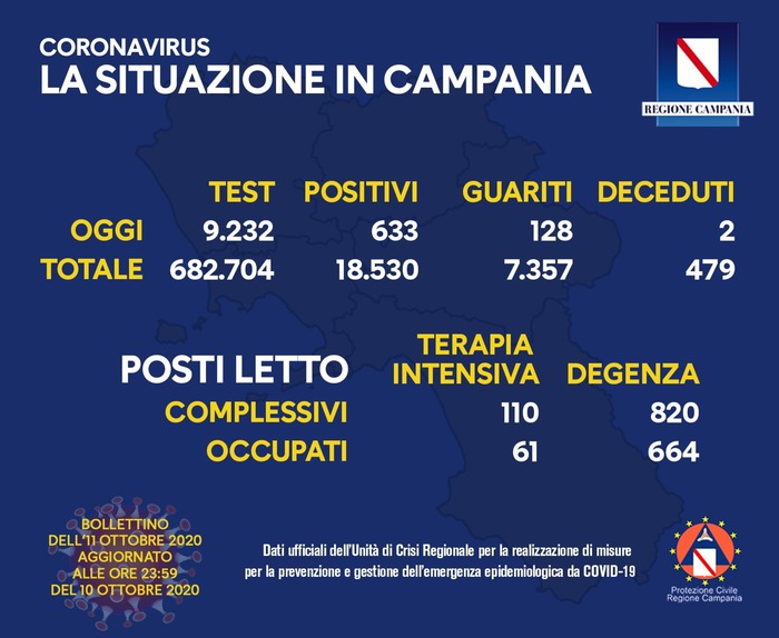 Rallenta ancora la crescita dei contagi in Campania: in 24 ore si registrano 633 positivi (ieri 664, due giorni fa 769) su 9.232 tamponi (ieri 9.031, due giorni fa 9.549) e si contano due persone morte.