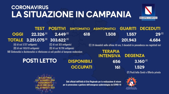 Sono 2449 (di cui 323 casi identificati da test antigenici rapidi) i casi di positività al Covid 19 accertati in Campania nelle ultime 24 ore.