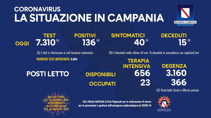 Sono 136 i nuovi positivi al Covid in Campania su 7.310 test molecolari esaminati ieri. Il tasso di incidenza si attesta all’1,86% rispetto al 3,57 precedente.