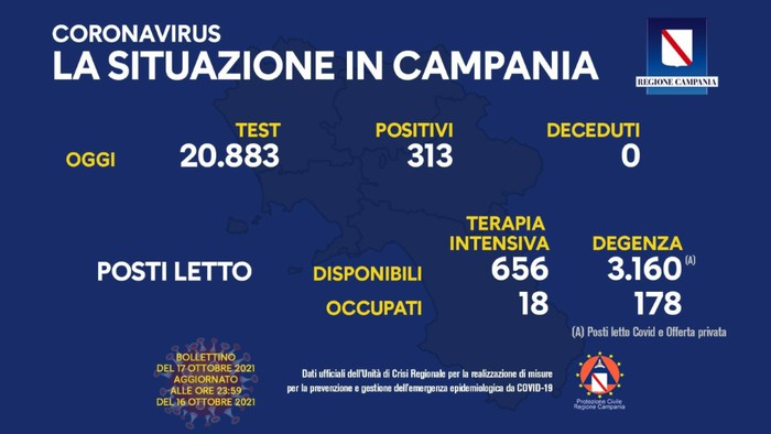 Nessuna nuova vittima da Covid viene segnalata in Campania nel bollettino odierno dell’Unità di crisi, ma rispetto a ieri sono in crescita i ricoveri, sia in intensiva (+3 l’occupazione dei posti letto), sia in degenza (+5).