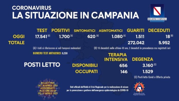 Sono 1.700 i nuovi positivi al Covid in Campania, di cui 620 sintomatici, su 17.541 test molecolari esaminati: il tasso di incidenza (calcolato solo su questi ultimi) risulta del 9,69%, in calo rispetto al 10,11 di ieri.
