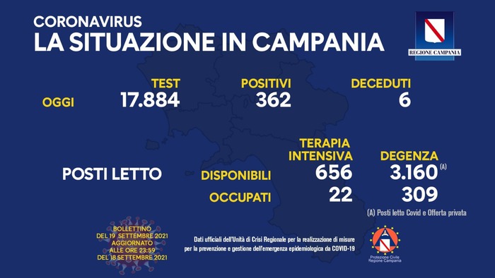 Sono 362 i nuovi positivi al Covid in Campania, su 17.884 test esaminati. Il tasso di incidenza torna a salire e si attesta al 2,02% rispetto all’1,90% precedente.