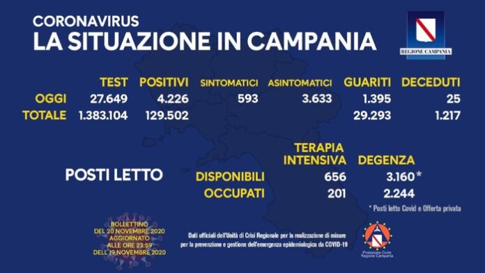 Sono 4.226 i nuovi contagi Covid rilevati in Campania (di cui 593 sintomatici) su 27.649 tamponi: il rapporto tra casi e test è al 15,28%.