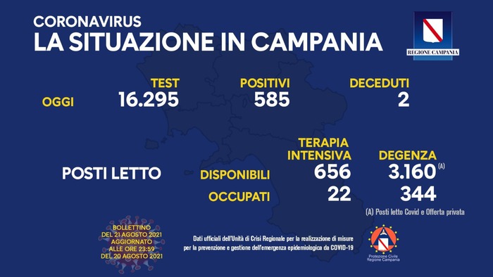 Sono 585 le persone risultate positive al Covid oggi in Campania a fronte di 16.295 test effettuati (il tasso di positività scende ancora e passa dal 4,12% al 3,59%).