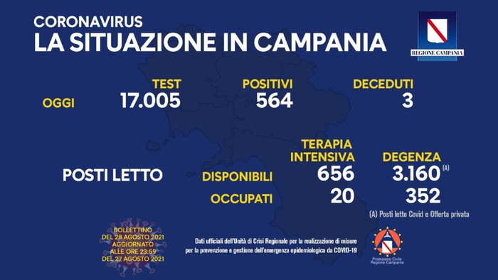 Sono 564 i nuovi positivi al Covid in Campania, su 17.005 test processati.