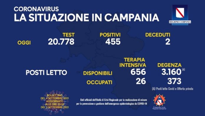 Sono 455 i nuovi positivi al Covid in Campania, su 20.778 test esaminati.