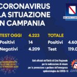 Coronavirus, aggiornamento, in Campania 4.602 casi totali, 14 positivi ieri.