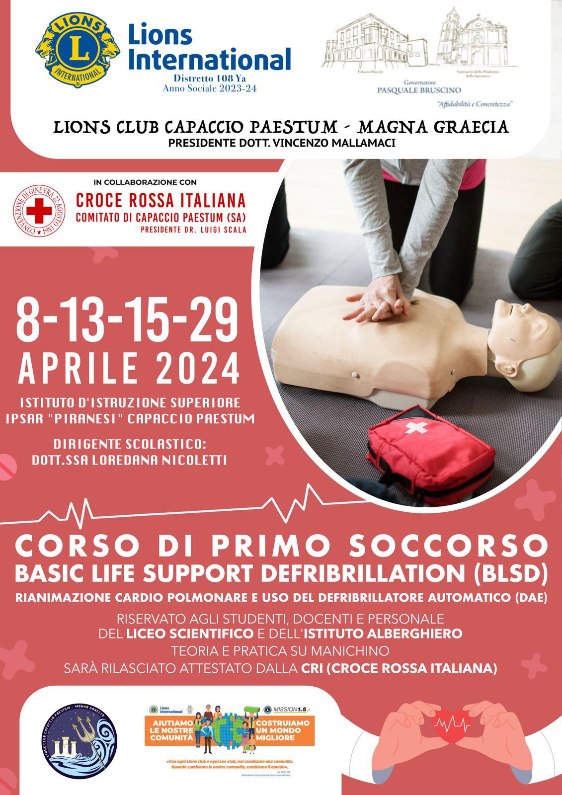 Organizzato dal Lions Club Capaccio Paestum – Magna Grecia, presieduto dal dottor Vincenzo Mallamaci, in collaborazione con la Croce Rossa Italiana Comitato Capaccio Paestum presieduta dal dottor Luigi Scala, il corso è rivolto agli studenti, ai docenti e al personale dell’istituto alberghiero e del liceo scientifico, diretto dalla professoressa Loredana Nicoletti.