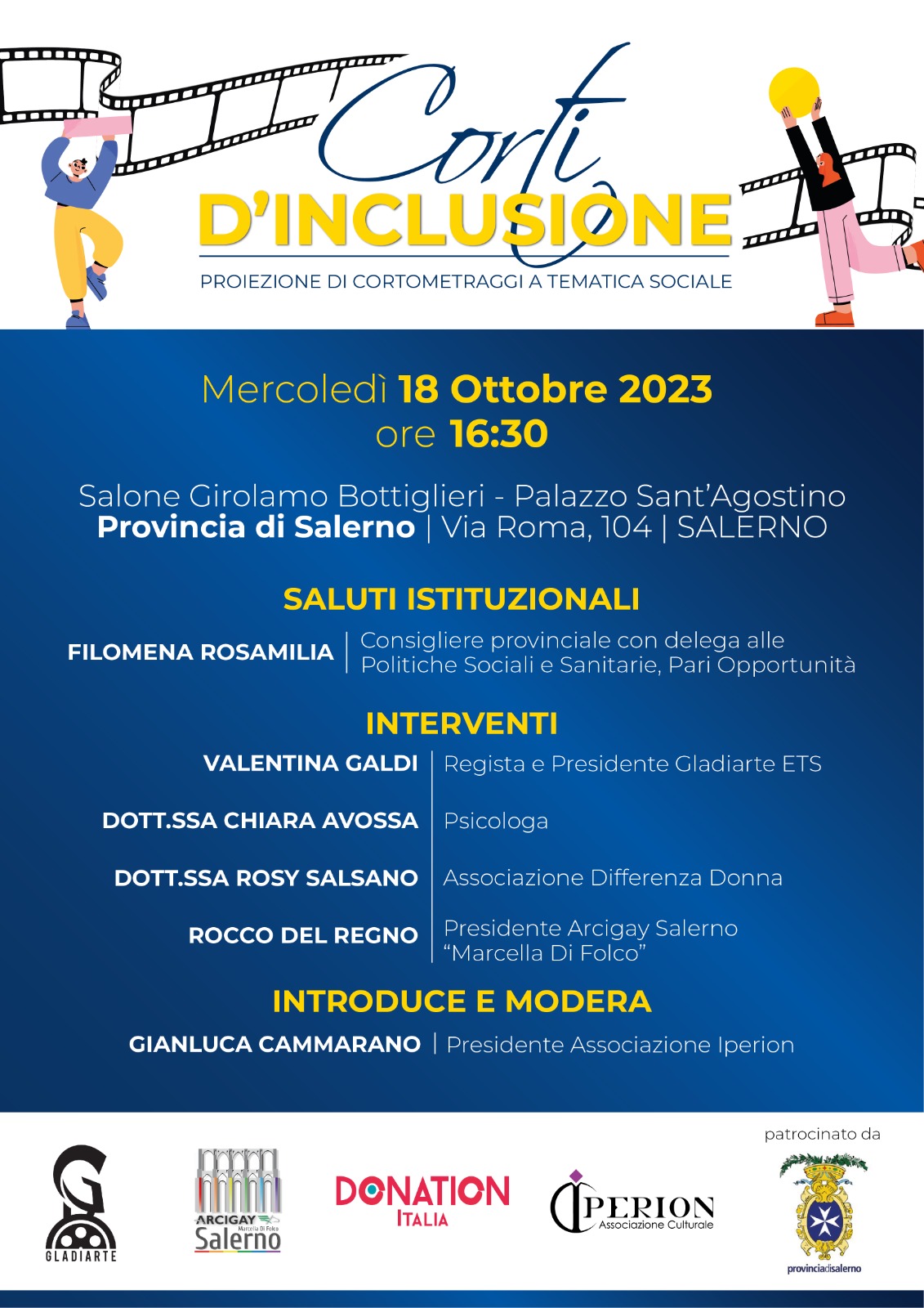 Mercoledì 18 Ottobre alle ore 16.30, il Salone Bottiglieri di Palazzo Sant’Agostino, in via Roma 104 – Salerno, ospiterà l’evento “Corti d’Inclusione”, organizzato dall’Ente del Terzo Settore Gladiarte e che vedrà la partecipazione di altre realtà attive nel salernitano quali Donation Italia, Arcigay Salerno “Marcella Di Folco”, Associazione Differenza Donna e Associazione Culturale Iperion. La manifestazione darà ampio spazio al dibattito su tematiche di attualità attraverso la proiezione di cortometraggi sociali, prodotti dall’associazione organizzatrice dell’evento.