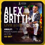 SABATO 2 SETTEMBRE. Novità 2023 è il gran finale con il concerto del chitarrista e cantautore Alex Britti in una location straordinaria, in Piazza Flavio Gioia II, direttamente sul mare di Amalfi, in programma alle ore 21:30 ad Ingresso Libero.