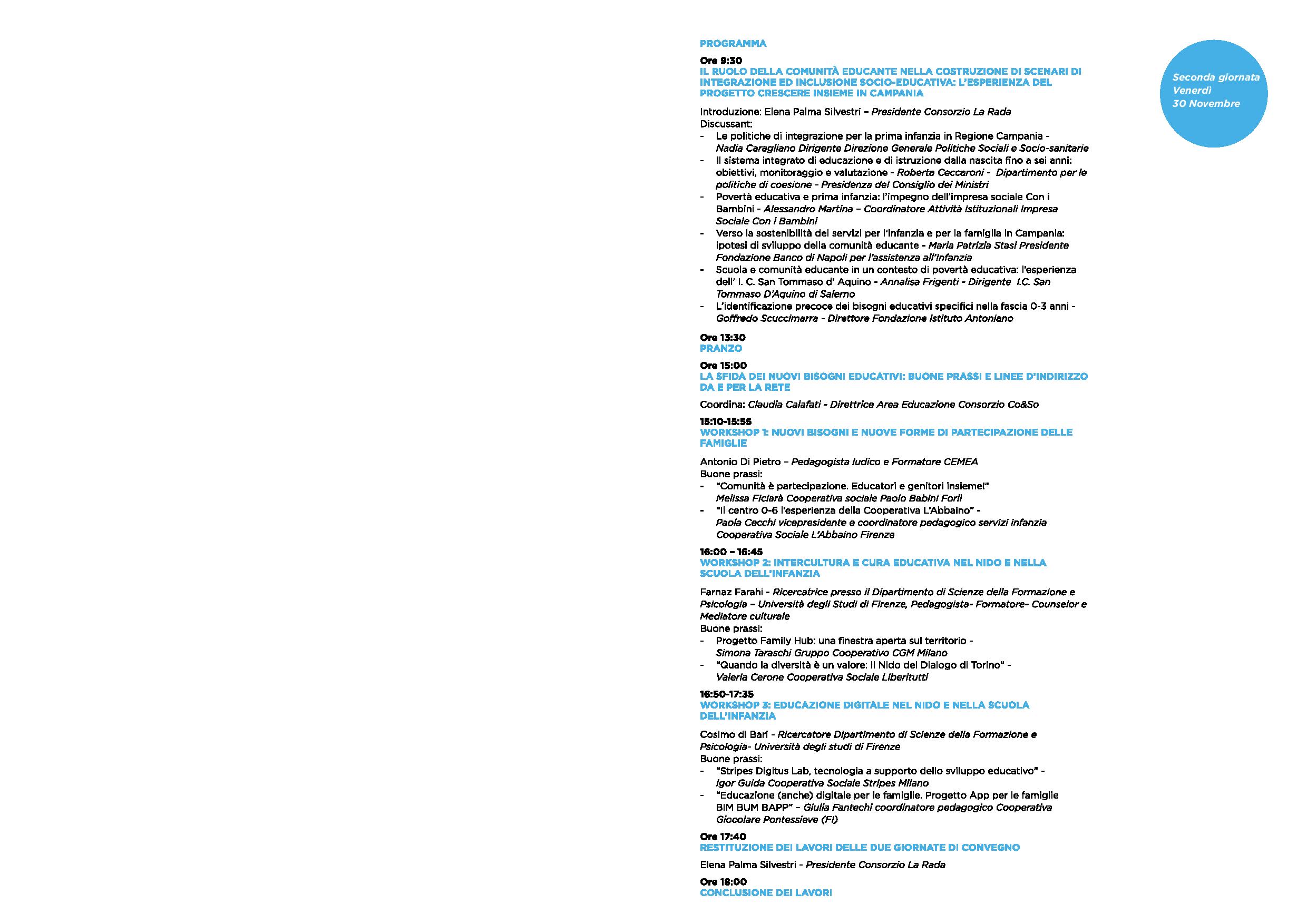 Sono previsti gli interventi di Fortunata Caragliano Dirigente Direzione Generale Politiche Sociali e Socio-sanitarie della Regione Campania, Roberta Ceccaroni – Dipartimento per le politiche di coesione – Presidenza del Consiglio dei Ministri; Alessandro Martina – Coordinatore Attività Istituzionali Impresa Sociale Con i Bambini, Maria Patrizia Stasi Presidente Fondazione Banco di Napoli per l’assistenza all’Infanzia, Annalisa Frigenti – Dirigente I.C. San Tommaso D’Aquino di Salerno, Goffredo Scuccimarra – Direttore Fondazione Istituto Antoniano.