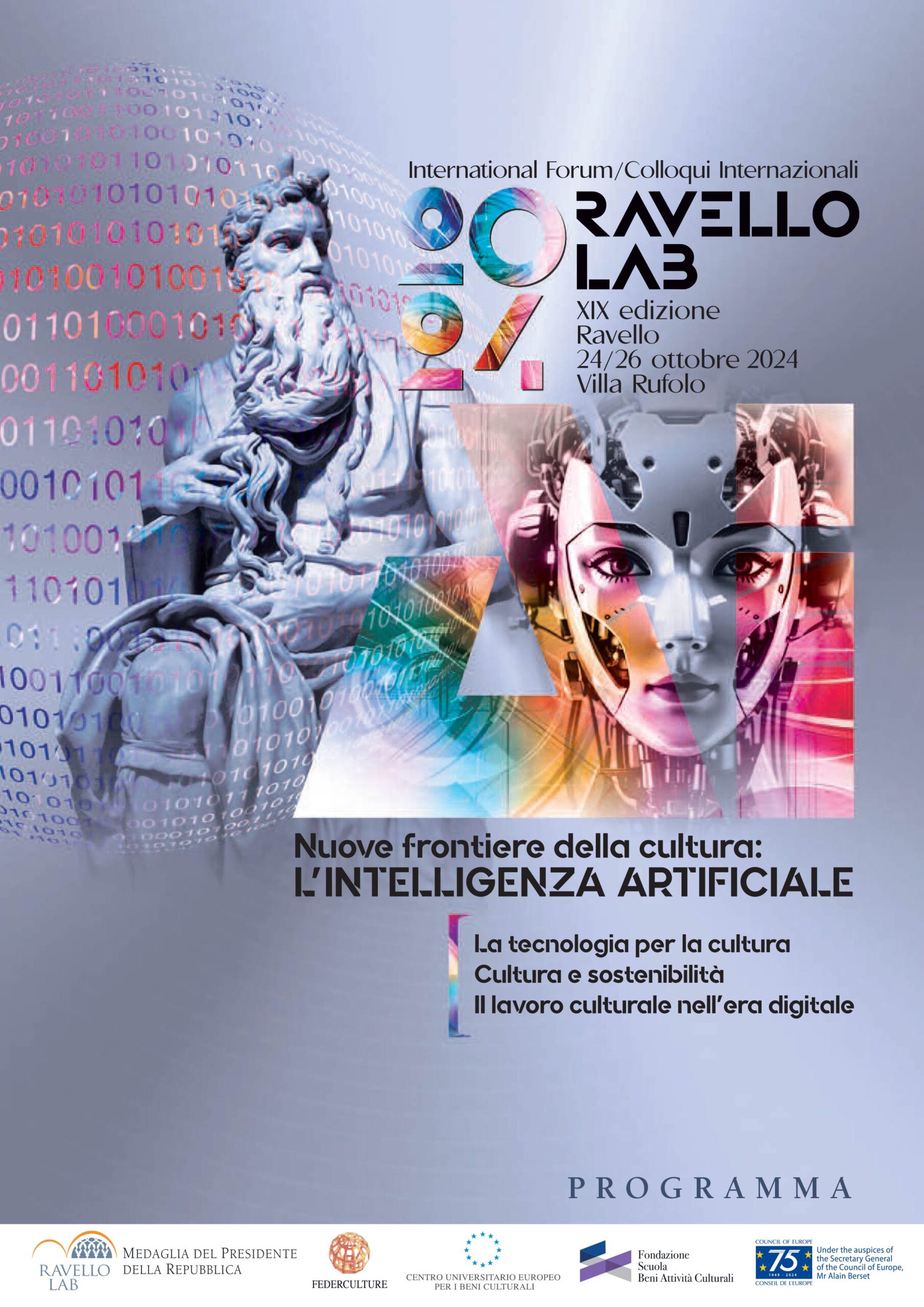 Giovedì 24, venerdì 25 e sabato 26 ottobre 2024, il Centro Universitario Europeo per i Beni Culturali, Federculture e Fondazione Scuola dei beni e delle attività culturali presentano a Ravello la diciannovesima edizione di RAVELLO LAB – Colloqui Internazionali, il forum europeo su cultura e sviluppo che quest’anno avrà come tema: Nuove frontiere della cultura: l’intelligenza artificiale.