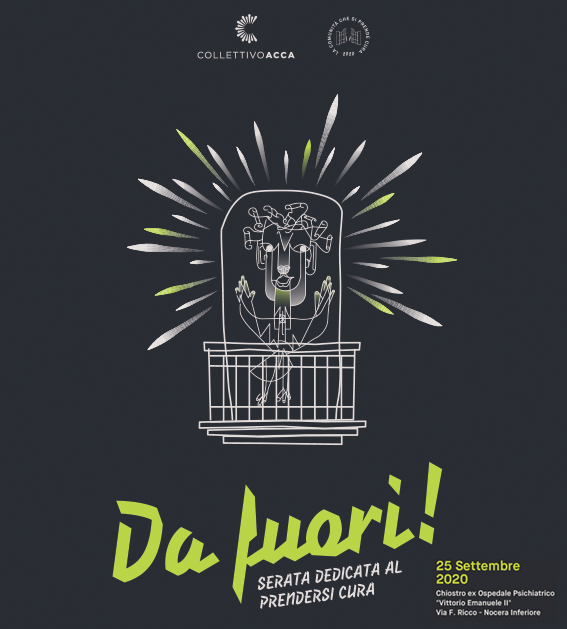 Venerdì 25 settembre 2020, presso il Chiostro dell’ex Ospedale Psichiatrico di Nocera Inferiore presso il Dipartimento Salute Mentale, in via F. Ricco, si terrà “DA FUORI! – serata dedicata al prendersi cura”.