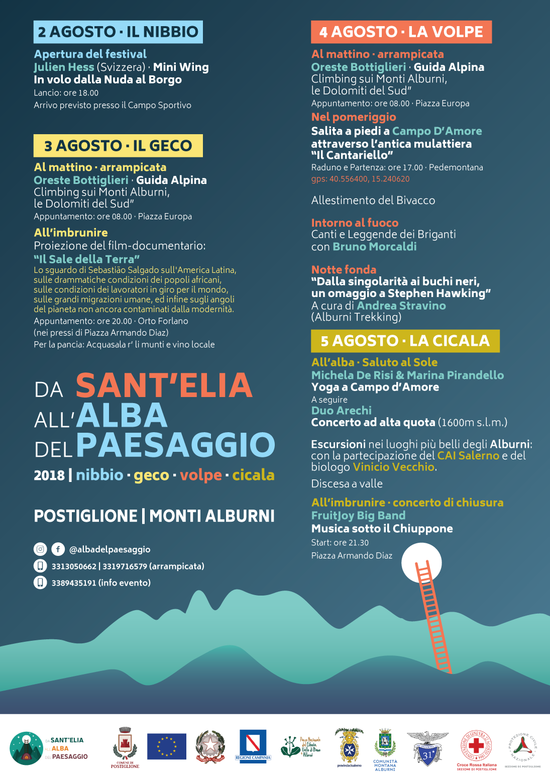 Si parte il 2 Agosto con un Julien Hess, svizzero ma figlio adottivo delle vette degli Alburni: lancio con mini-wing dalla vetta della Nuda (1704m s.l.m.) ed atterraggio nel campo sportivo di Postiglione dopo un volo fatto di evoluzioni, correnti, picchiate e risalite. Il 3 e 4 mattina con Oreste Bottiglieri, celebre Guida Alpina, sarà possibile scalare la Falesia dei Briganti in una due giornate di climbing ed adrenalina pura. Il 3 Agosto, all’imbrunire, l’orto di Zi Giovanni Forlano ospiterà la proiezione del film documentario di successo mondiale “Il Sale della Terra”, sguardo del noto fotografo Sebastiao Salgado sull’America Latina, sulle drammatiche condizioni dei popoli africani, sulle condizioni dei lavoratori in giro per il mondo, le grandi migrazioni umane ed infine sugli angoli del pianeta non ancora contaminati dalla modernità. Un momento per gli occhi, ma anche per la pancia con la possibilità di assaggiare “l’acquasala r’ li munti”, le “frese spunzate” nell’acqua e condite con pomodori locali, olio paesano ed origano degli Alburni, il tutto annaffiato, ovviamente, dal vino bianco delle cantine postiglionesi. Dopo il climbing mattutino, il 4 agosto è la volta della salita su Campo D’Amore, luogo tra i più suggestivi degli Alburni a cui si legano leggende, amori, lavori e storie che si perdono nella notte dei tempi. Si parte alle 17.00 attraverso l’antica mulattiera del Cantariello, scavata dai pastori transumanti secoli addietro, fino ad arrivare sul pianoro dove verrà allestito il bivacco. Intorno al fuoco Bruno Morcaldi, brigante postiglionese, racconterà di schioppettate, di amori, di briganti e di re, di leggende e di racconti, di canti antichi e poemi della terra. A notte fonda Andrea Stravino, di Alburni Trekking, farà volgere lo sguardo dei presenti all’immenso oceano di stelle che dall’alto delle cime alburnine è possibile osservare limpidamente, fino quasi a toccarle. Un omaggio a Stephen Hawking, recentemente scomparso, “dalle singolarità sino ad arrivare ai buchi neri”. Col sole nascente tra le cime, gli escursionisti saluteranno l’astro solare in un momento di Yoga e riflessione interiore con Michela De Risi e Marina Pirandello di Ludosya.