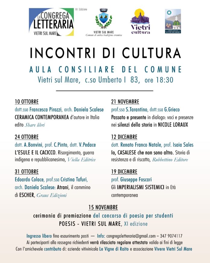 L’associazione culturale La Congrega Letteraria, in collaborazione con il Comune di Vietri sul Mare e la Pro Loco Vietri sul Mare, è lieta di presentare il calendario di Incontri di cultura, XII edizione. Gli eventi, inseriti nella programmazione comunale “Vietri Cultura” si terranno presso la prestigiosa aula consiliare del comune, in c.so Umberto I  83, con inizio alle ore 18:30.