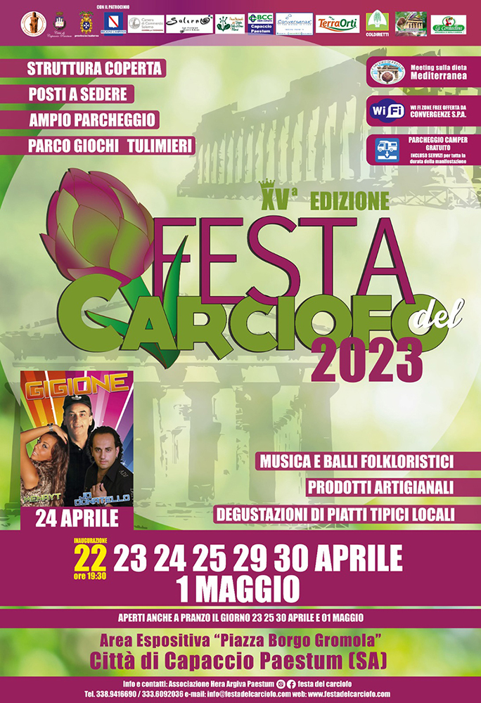 Ritorna la festa, ormai celebre, dedicata all’ortaggio Re della Primavera: Il Carciofo di Paestum IGP. L’evento si svolgerà nel borgo di Gromola a Capaccio-Paestum dal 22 al 25 Aprile e, nuovamente il 29 Aprile e il 1^ Maggio 2023.