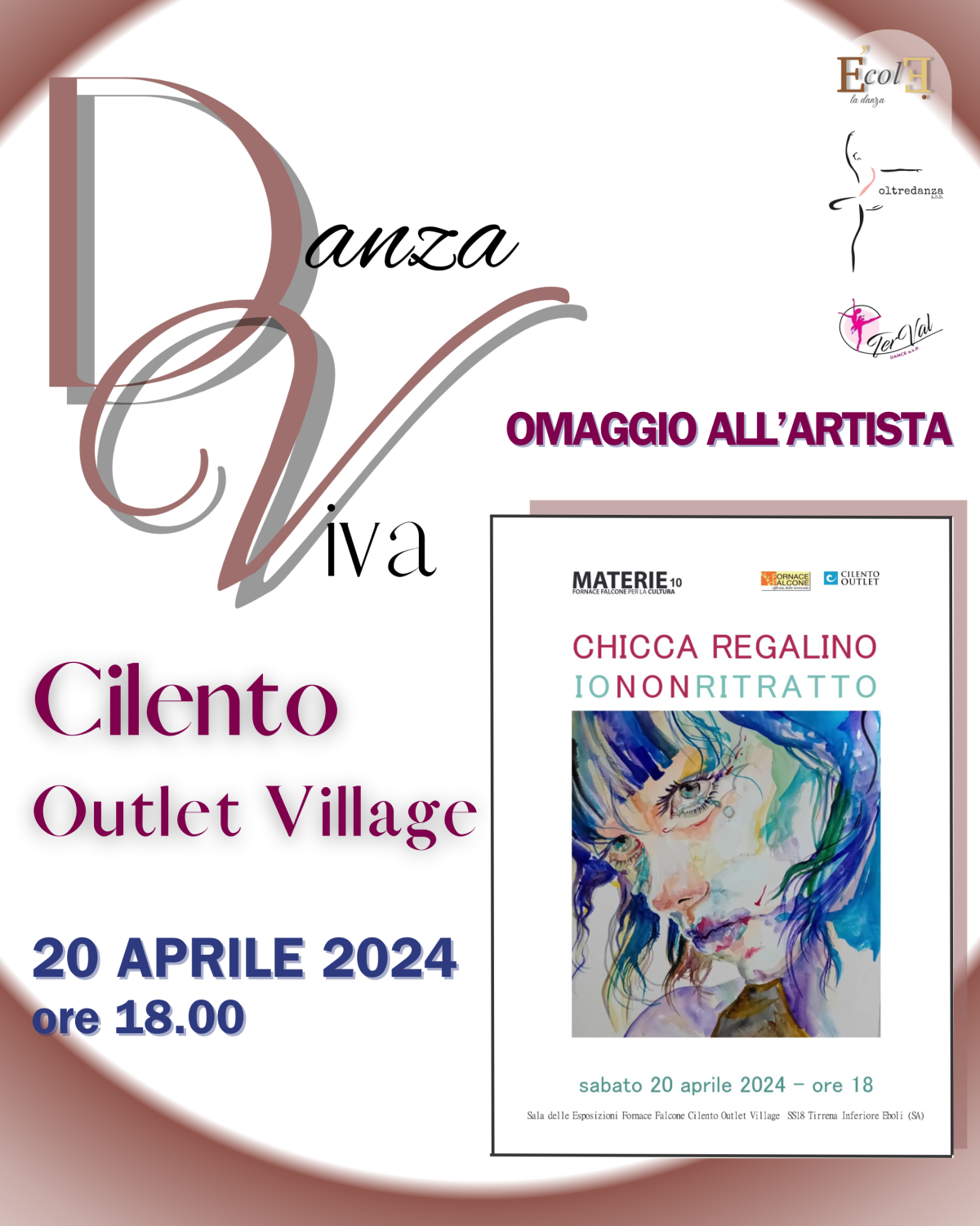 Proprio per tale motivo, il 20 Aprile 2024, il gruppo Danza Viva omaggerà l’arista Chicca Regalino, presso la Sala delle Esposizioni Fornace Falcone all’Outlet Cilento Village, con cinque performance create ad hoc per l’evento ed ispirate ad alcune delle opere protagoniste della serata.