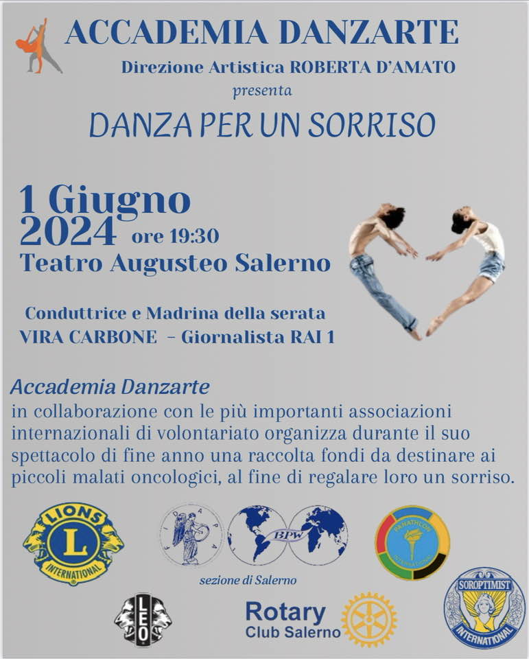 Intorno ad Accademia Danzarte le maggiori associazioni Lions, Leo, Rotary, Interact Panathlon Club Salerno, Fidapa BPW Salerno e il club del Soroptimist International di Salerno si sono unite per creare uno spettacolo di fine anno con raccolta fondi da destinare ai piccoli malati oncologici , al fine di regalare loro un sorriso.