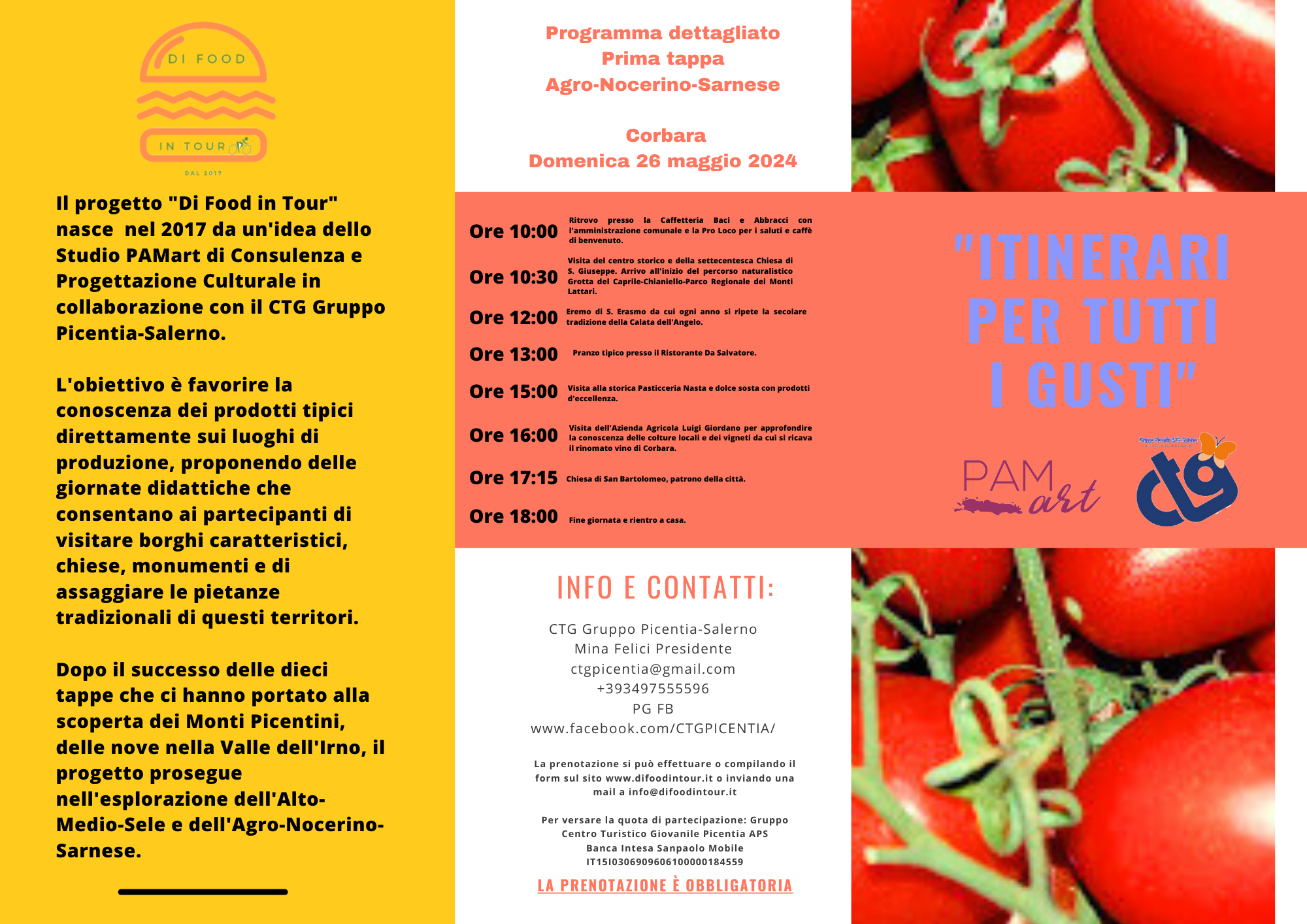 La Vicesindaca Monica Tramparulo ha sostenuto: “Siamo felici di ospitare questa iniziativa che dal 2017 sta facendo conoscere la provincia di Salerno a numerosi visitatori. Accogliamo sempre con gioia queste iniziative a Corbara perché riteniamo come amministrazione comunale di promuovere maggiormente il turismo soprattutto quello dei borghi e di prossimità. Speriamo che in futuro la nostra cittadina possa diventare un esempio virtuoso sul territorio dellAgro-Nocerino-Sarnese, accogliendo visitatori di varie nazionalità, per far vivere loro esperienze coinvolgenti a trecentosessanta gradi. Complimenti alle donne e professioniste che portano avanti questo progetto, sono molto coraggiose ma d’altronde chi non si da da fare non ottiene nulla”. La Presidente Mina Felici ha aggiunto: “Le prenotazioni sono aperte sino a venerdì 24 maggio, invitiamo quindi tutti a darsi da fare tramite il modulo online compilabile sul nostro portale e a non perdere questo interessante tour alle porte di un nuovo territorio che siamo pronte ad esplorare in lungo e in largo, come abbiamo sempre fatto ormai da sette anni a questa parte”. La vicepresidente e giornalista enogastronomica Annamaria Parlato ha dichiarato: “Corbara è conosciuta per il pomodoro corbarino che ogni chef o pizzaiolo brama per le proprie creazioni culinarie. E’ una eccellenza che presto riceverà riconoscimenti importanti a livello di denominazioni. Anticamente però esistevano numerose colture, come i limoni ad esempio, o la vite che si stanno pian piano recuperando. Il vino di Corbara era noto anche ai Romani, tant’è che le condizioni pedoclimatiche particolarissime e irripetibili danno vita al Cruàra, un prodotto unico. Domenica si scopriranno molte situazioni interessanti che sicuramente incanteranno i partecipanti, desiderosi di scoprire le bellezze campane”. Il Food Blog 2Ingredienti Arte&Cibo sarà media partner dell’evento.
