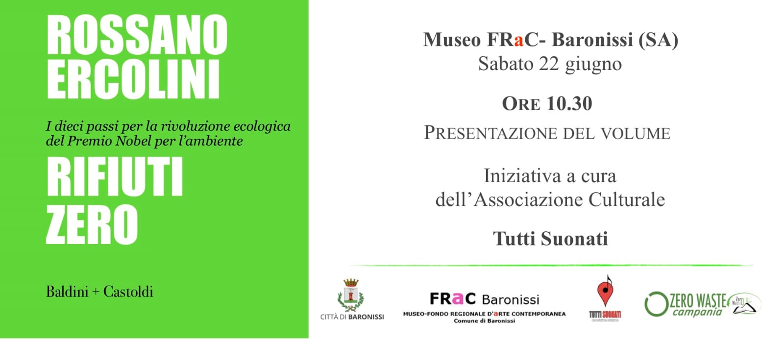 “Rifiuti Zero”. Dieci passi per la rivoluzione ecologica dal Premio Nobel per l’ambiente, Rossano Ercolini, che presenta il suo libro al Museo FRaC sabato 22 giugno alle ore 10.30, a cura dell’ Associazione Culturale Tutti Suonati. Presidente dell’associazione Zero Waste Europe, Ercolini ha ricevuto il Goldman Environmental Prize 2013, il Nobel alternativo per l’ambiente e nel 2015 gli è stato conferito il“Premio Nazionale Paolo Borsellino” per il suo impegno civile.