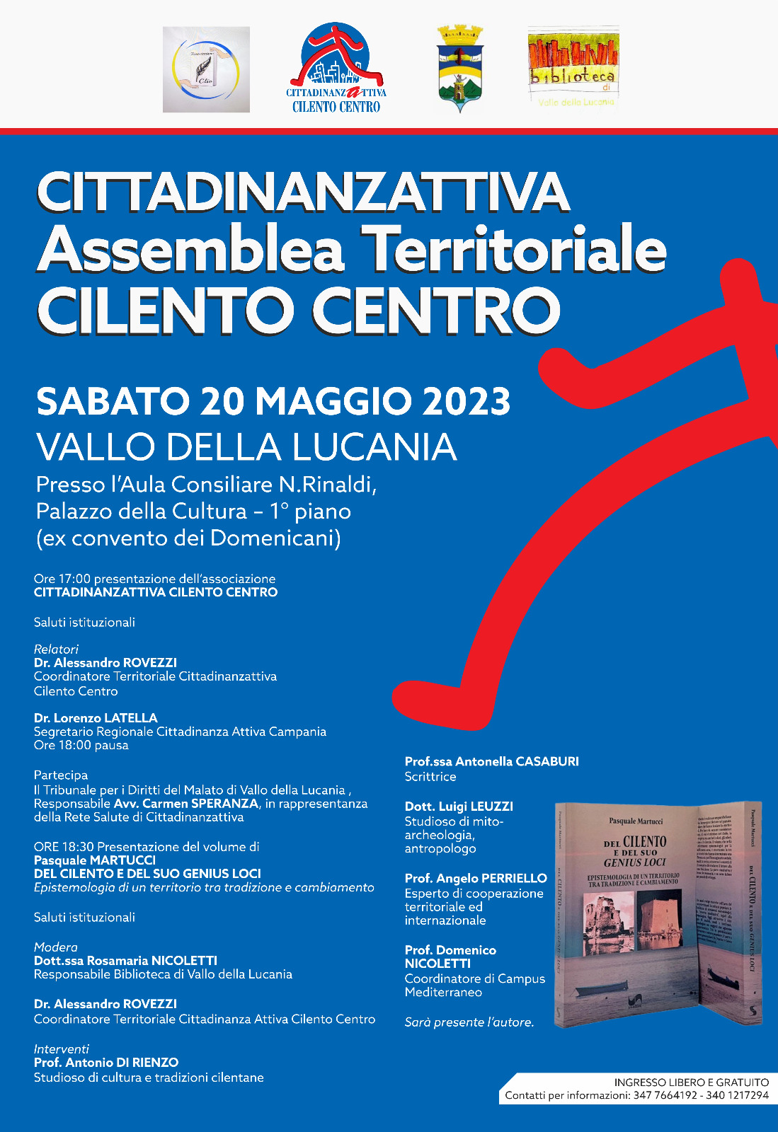 Alle ore 18:30 ci sarà la presentazione del volume: “Del Cilento e del suo Genius Loci. Epistemologia di un territorio tra tradizione e cambiamento”. Oltre all’autore del libro, il sociologo Pasquale Martucci, interverranno: il prof. Antonio Di Rienzo (Studioso di cultura e tradizioni cilentane); la prof.ssa Antonella Casaburi (Scrittrice); il dott. Luigi Leuzzi (Studioso di mito-archeologia, antropologo); il prof. Angelo Perriello (Esperto di cooperazione territoriale ed internazionale); il prof. Domenico Nicoletti (Coordinatore di Campus Mediterraneo). I lavori saranno moderati dalla dott.ssa Rosamaria Nicoletti (Responsabile della Biblioteca di Vallo della Lucania) e dal dott. Alessandro Rovezzi (Coordinatore Territoriale Cittadinanza Attiva Cilento Centro).