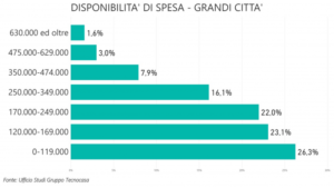 Nelle altre grandi città, Bari, Genova, Napoli, Palermo e Torino la disponibilità di spesa resta concentrata nella fascia di spesa inferiore a 120 mila €.