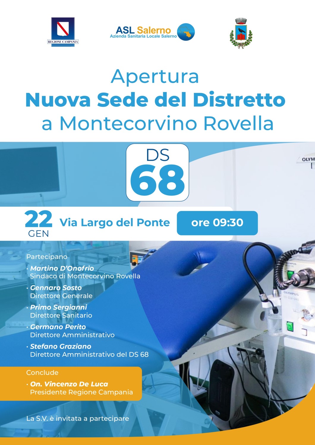 Mercoledì 22 gennaio 2025, alle ore 09.30, si terrà l’apertura della nuova sede del Distretto Sanitario a Montecorvino Rovella che si trova in Via Largo del Ponte.