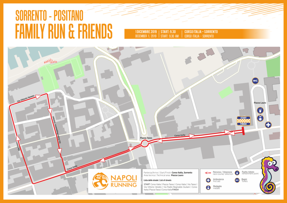 FAMILY RUN – La Family Run & Friends è una gara non competitiva, aperta a tutti da 0 a 99 anni. Non è necessario presentare il certificato medico ed è gratuita per i bambini fino a 10 anni e per gli over 65. Puoi passeggiare, correre o fermarti, farti selfie, portare il tuo cane. L’obiettivo è uno: il divertimento! La partenza è in Corso Italia, Piazza Angelina Lauro l’1 dicembre 2019 alle ore 9.30 subito dopo la partenza della Panoramica. Tanti premi per i partecipanti: la maglietta con la mascotte Virgilio – un simpatico ippocampo – e la medaglia. Anche a Positano sabato alle ore 10.30 si vivrà la Family Run aperta a tutte le famiglie della perla dell’Amalfitana.